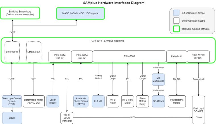 O projeto SAMplus envolve o gerenciamento de logs, interface com usuário, telas de parametrização, protocolos de comunicação com dispositivos, cálculos específicos e otimização do processamento. Para isso ocorrer, há a operação de três softwares distintos em três dispositivos diferentes. A captura da imagem do sensor de frente de onda (protocolo CameraLink) e o loop de controle principal são realizados no FPGA (Field Programmable Gate Array), enquanto outros loops de controle, aquisição de dados e interfaces de hardware são gerenciados no software em tempo real, executado no controlador PXIe-8840 com o sistema operacional Linux-RT. Por outro lado, o software de Interface Gráfica do Usuário opera em um outro computador com o sistema operacional Windows.