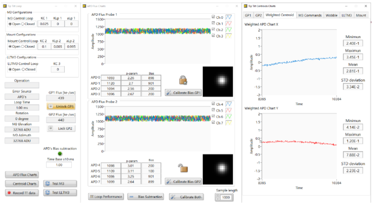 A seguir temos a visualização dos sensores do tipo APD (Avalanche Photodiodes), e os parâmetros de controle de TIP/TILT (movimentação do telescópio):