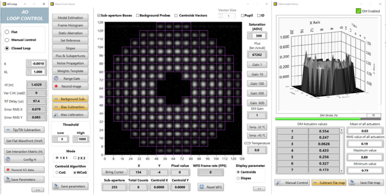 Foram desenvolvidas telas de óptica adaptativa que permitem visualizar a imagem coletada pela câmera, ajustar ganhos de controle, rotinas de calibração das matrizes, além de ser possível a verificação da qualidade da atuação do espelho deformável.