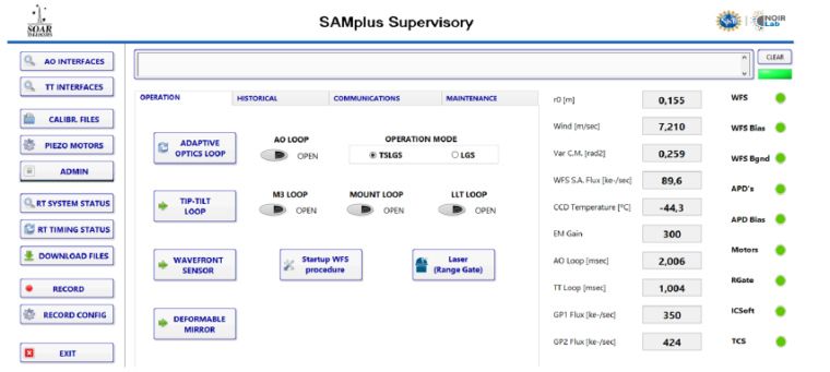 É interface principal. Exibe as informações gerais de toda a operação, de maneira organizada e com fácil visualização, que permite controlar e visualizar processos como: fluxo no WFS (Wave front sensor), uso de espelho deformável e status de hardware. É nesta tela que também ocorrem as chamadas de outras interfaces, permitindo então que sejam exibidos parâmetros mais específicos. Na interface principal estão presentes botões e visualizadores, como demonstra a imagem a seguir: