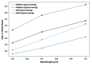 Figura 1: Melhorias esperadas com o SAM-Plus. O “Strehl ratio” é uma comparação entre uma imagem observada e uma imagem perfeita, limitada pela difração.